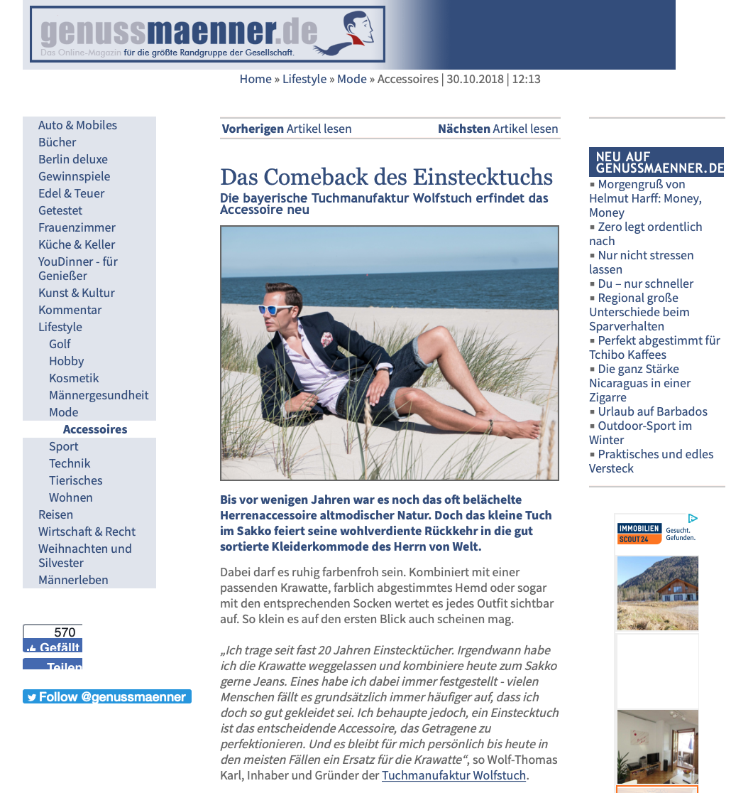 Die bayrische Tuchmanufaktur Wolfstuch erfindet das Accessoire neu. - Bis vor wenigen Jahren war es noch das oft belächelte Herrenaccessoire altmodischer Natur.